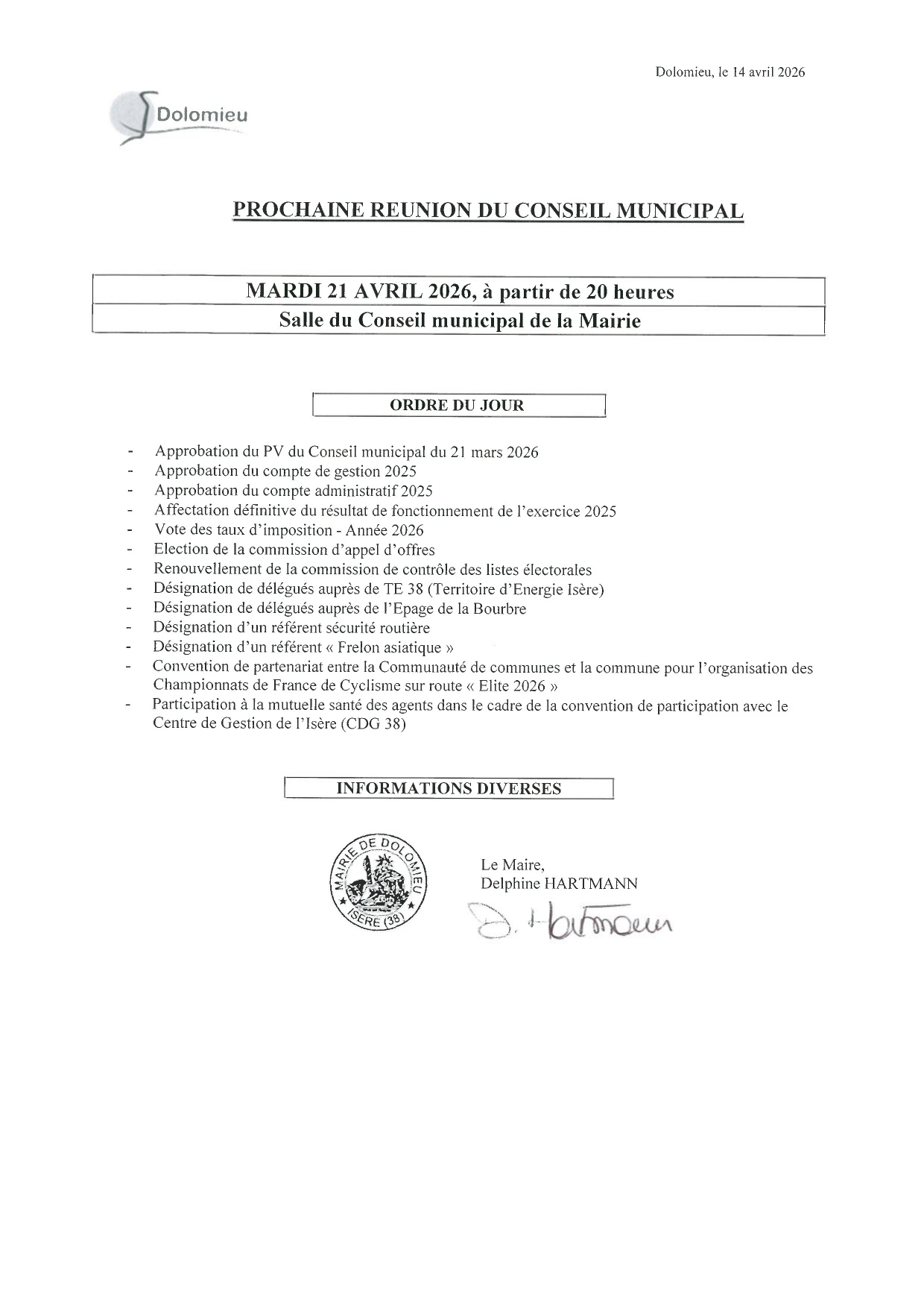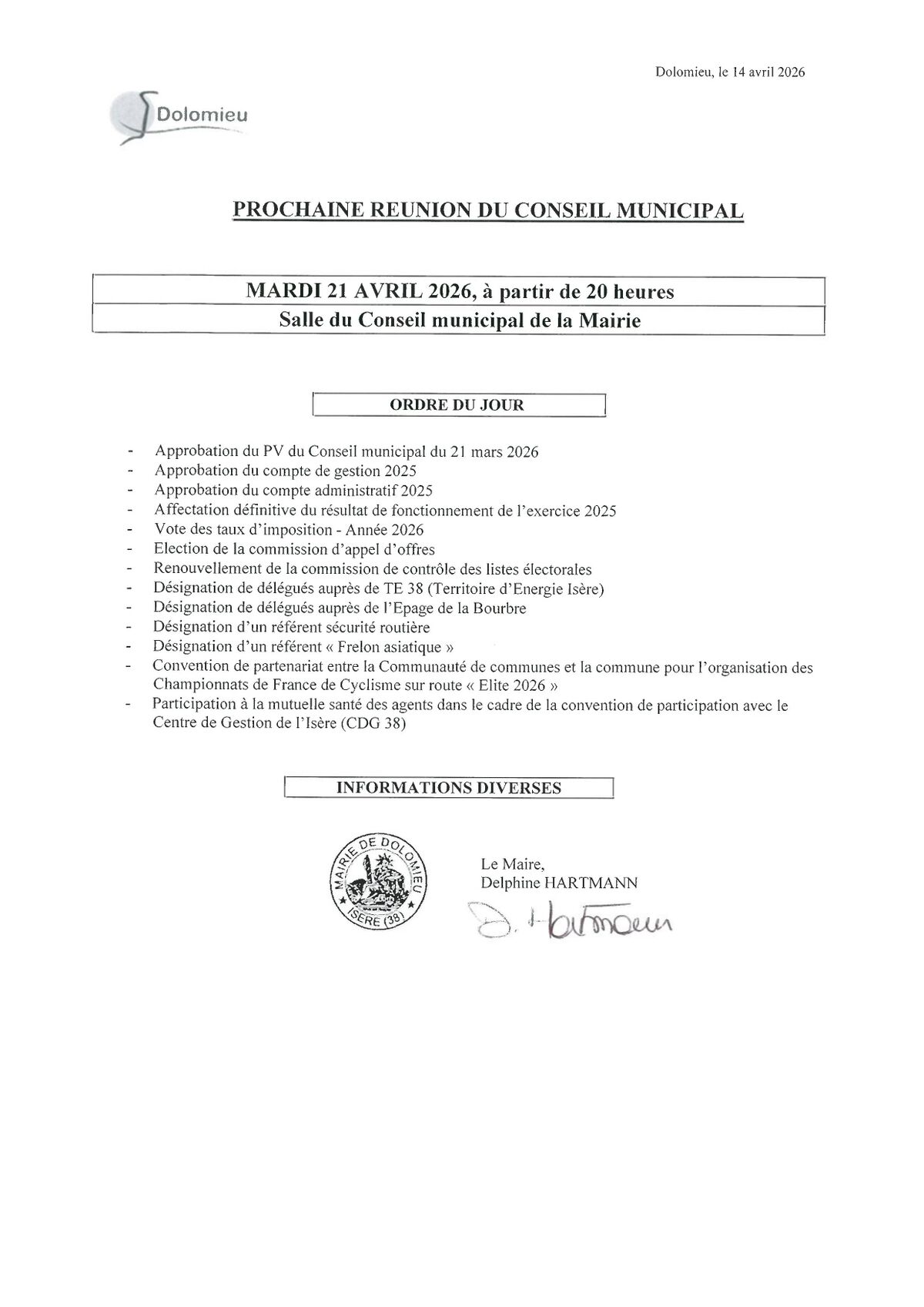 Ordre du jour du prochain Conseil Municipal